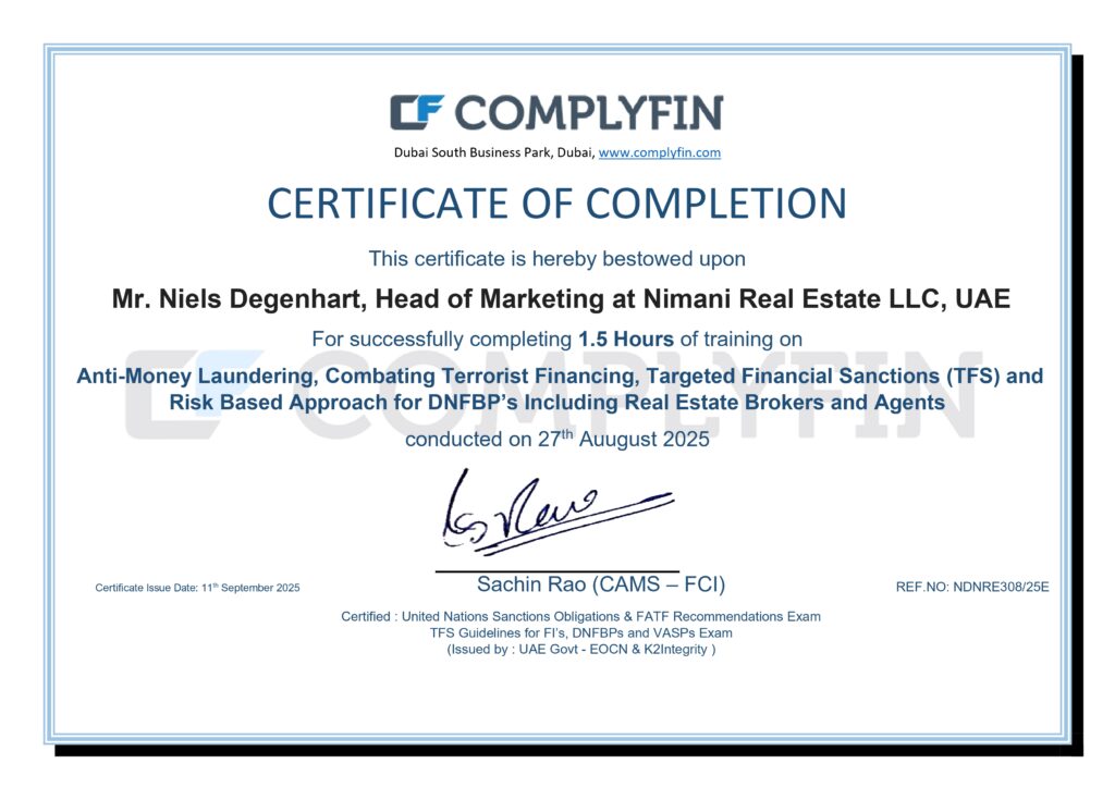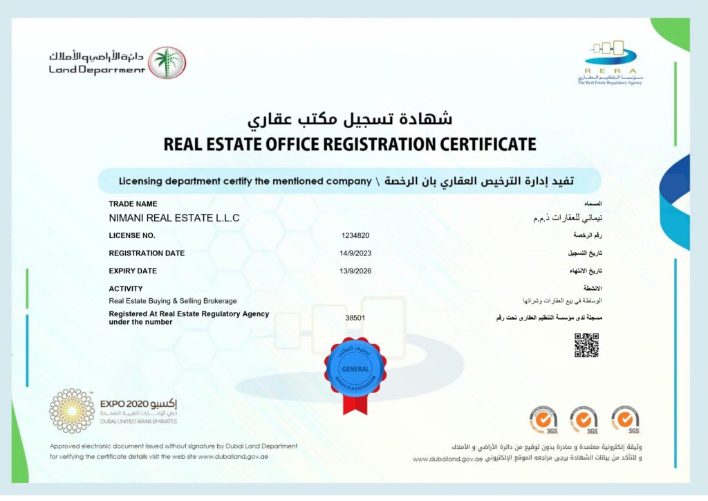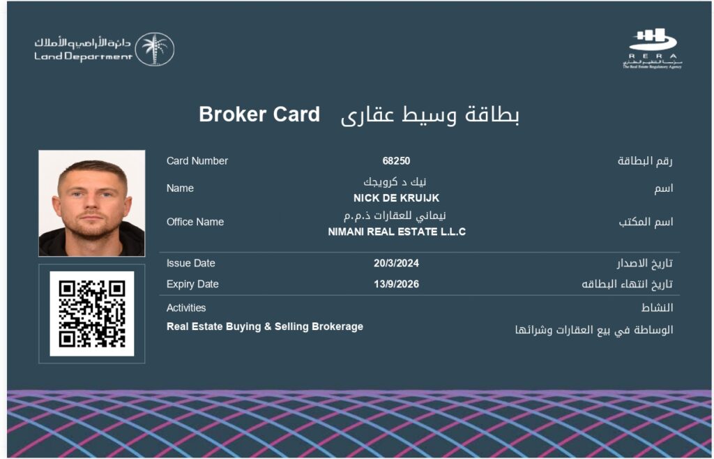 Nimani is officially registered with RERA (Real Estate Regulatory Agency), the main regulatory authority for the Dubai real estate market. Only certified and approved entities are allowed to promote and sell property in Dubai, and Nimani is proudly part of that select group.